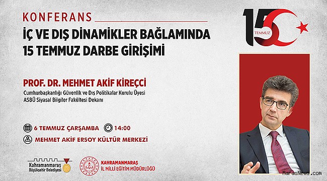 Kahramanmaraş Büyükşehir Belediyesi, kültür sanat etkinliklerini Kahramanmaraşlılarla buluşturmaya devam ediyor. Büyükşehir Belediyesi ve İl Milli Eğitim Müdürlüğü iş birliğiyle 6 Temmuz Çarşamba günü Cumhurbaşkanlığı Güvenlik ve Dış Politikalar Kurulu Üyesi ve Ankara Sosyal Bilimler Üniversitesi Siyasal Bilgiler Fakültesi Dekanı Prof. Dr. Mehmet Akif Kireçci’nin katılımıyla ‘İç ve Dış Dinamikler Bağlamında 15 Temmuz Darbe Girişimi’ temalı konferans gerçekleştirilecek. Mehmet Akif Ersoy Kültür Merkezi’nde katılımcılarla buluşacak konferans saat 14.00’te başlayacak. 15 Temmuz gecesi yaşanan hain darbe girişimi ve daha sonrasında yaşanan süreçler gibi pek çok konunun masaya yatırılacağı etkinliğe tüm Kahramanmaraşlılar davet edildi.