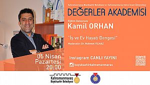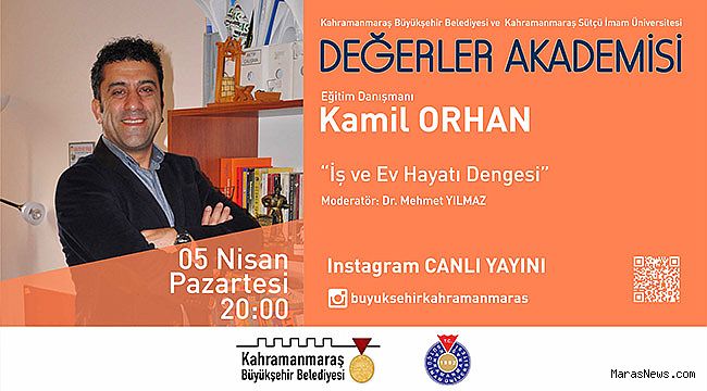 Kahramanmaraş Büyükşehir Belediyesi ve Kahramanmaraş Sütçü İmam Üniversitesi işbirliği ile gerçekleştirilen Değerler Akademisi, 5 Nisan Pazartesi (bugün) Prof. Dr. Kamil Orhan’ın konuk olacağı programla devam edecek. Saat 20.00’da Büyükşehir Belediyesi Instagram hesabından canlı yayınlanacak programda, ‘İş ve Ev Hayatı Dengesi’ üzerine konuşulacak. Dr. Mehmet Yılmaz moderatörlüğünde gerçekleştirilecek programda, yoğun iş hayatının aile yaşamına etkisi, aile ve iş dengesi ve iş hayatındaki yaşanan olumsuzlukların aileye yansıtılmaması gibi pek çok konu masaya yatırılacak.