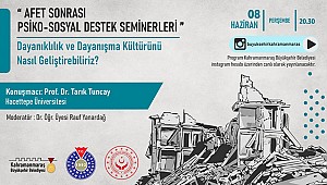 Kahramanmaraş Büyükşehir Belediyesi, Kahramanmaraş Sütçü İmam Üniversitesi ve Aile ve Sosyal Hizmetler İl Müdürlüğü iş birliğiyle hayata geçirilen Afet Sonrası Psiko-Sosyal Destek Seminerleri, vatandaşlarla buluşmaya devam ediyor. Etkinlik takvimi kapsamında, 8 Haziran Perşembe günü Hacettepe Üniversitesi Öğretim Üyesi Prof. Dr. Tarık Tuncay’ın katılımıyla ‘Dayanıklılık ve Dayanışma Kültürünü Nasıl Geliştirebiliriz?’ temalı eğitim semineri gerçekleştirilecek. Büyükşehir’in Instagram hesabından canlı yayınlanacak seminer, saat 20.30’da başlayacak. Moderatörlüğünü KSÜ Dr. Öğr. Üyesi Rauf Yanardağ’ın yapacağı etkinlikte Prof. Dr. Tuncay; deprem sonrası şehrin ve toplumun ayağa kaldırılmasını noktasında birlik ve beraberliğin, dayanışmanın önemine dair birbirinden değerli bilgiler aktaracak.