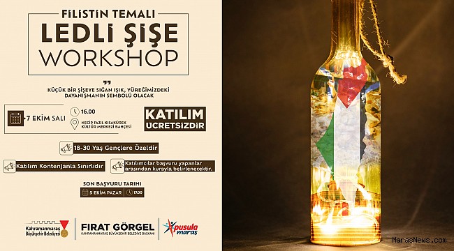 Kahramanmaraş Büyükşehir Belediyesi, gençlere yönelik anlamlı faaliyetlerini Pusula Maraş çatısı altında sürdürürken, Filistin’de yaşanan zulme dikkat çekmek ve farkındalık oluşturmak amacıyla özel bir etkinliği daha hayata geçiriyor. Gençlik Hizmetleri Şube Müdürlüğü koordinesinde 7 Ekim Salı günü Necip Fazıl Kısakürek Kültür Merkezi bahçesinde düzenlenecek atölyede, “Filistin Temalı Ledli Şişe” çalışması gerçekleştirilecek. 18 – 30 yaş aralığındaki gençlerin katılım sağlayabileceği etkinlikte, küçük bir şişeye yerleştirilecek ışıkla hem dayanışmanın sembolü olunacak hem de Filistin halkına destek mesajı verilecek. Etkinliğe katılmak isteyen gençler, https://kahramanmaras.bel.tr/duyuru/2025/10/01/filistin-temali-ledli-sise-workshop-basvuru-formu internet adresindeki başvuru formunu doldurarak kayıt yaptırabilecek. Son başvuru tarihi 5 Ekim Pazar.