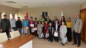 teşekkürlerini sunarken turnuvalarda elde edilen birincilik kupasını Rektör