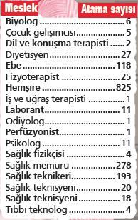 27 diyetisyen, 118 ebe, 25 fizyoterapist, 825 hemşire, 1 iş ve uğraş terapisti,