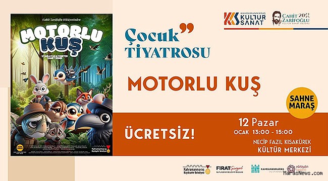 Kahramanmaraş Büyükşehir Belediyesi, sosyal belediyecilik anlayışı çerçevesinde farklı yaş gruplarına yönelik kültür ve sanat etkinliklerini hız kesmeden sürdürüyor. Bu kapsamda, çocuklara özel hazırlanan “Motorlu Kuş” adlı tiyatro oyunu, 12 Ocak Pazar günü minik izleyicilerle buluşmaya hazırlanıyor. Cahit Zarifoğlu’nun etkileyici hikâyesinden sahneye uyarlanan “Motorlu Kuş”, Necip Fazıl Kısakürek Kültür Merkezi’nde izleyicilerin karşısına çıkacak. Büyükşehir Belediyesi Sahne Maraş Tiyatro Okulu öğrencileri tarafından sahnelenecek oyun, 13.00 ve 15.00 saatlerinde iki ayrı seans olarak perde açacak.