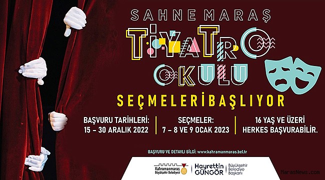 Kahramanmaraş Büyükşehir Belediyesi tarafından düzenlenen Sahne Maraş Tiyatro Okulu’nda yeni dönem eğitimleri için ön kayıtlar başlıyor. Büyükşehir Belediyesi’nin internet sitesi üzerinden çevrimiçi olarak gerçekleştirilecek kayıtlar 15 Aralık Perşembe günü başlayıp 30 Aralık Cuma gününe kadar devam edecek. 16 yaş üzeri vatandaşların başvuru yapabileceği Sahne Maraş Tiyatro Okulu seçmeleri ise 7 – 8 ve 9 Ocak 2023 tarihlerinde Necip Fazıl Kısakürek Kültür Merkezi’nde gerçekleştirilecek. Toplamda 16 hafta sürecek eğitimlerde öğrencilere alanında uzman eğitmenler tarafından yaratıcı drama, duruş, diyafram - nefes gibi tiyatral eğitimler verilecek. Sahne Maraş Tiyatro Okulu yeni dönem eğitimleri için başvuru formuna ve detaylı bilgiye Büyükşehir Belediyesi’nin internet sitesinde (https://kahramanmaras.bel.tr) duyurular bölümünden ulaşılabiliyor.