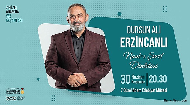 Kahramanmaraş Büyükşehir Belediyesi, kültür sanat etkinliklerini vatandaşlarla buluşturmaya devam ediyor. Kültür sanat etkinlikleri kapsamında, 30 Haziran Perşembe günü (yarın) Şair Dursun Ali Erzincanlı, Naat – ı Şerif dinletisi etkinliğinde Kahramanmaraşlılarla bir araya gelecek. Yedi Güzel Adam Edebiyat Müzesi’nde gerçekleştirilecek etkinlik saat 20.30’da başlayacak. Kültür Spor ve Turizm Dairesi Başkanlığı’ndan yapılan açıklamada, ücretsiz etkinliğe tüm vatandaşların davet edildiği belirtildi.