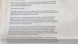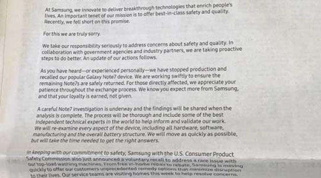 Yaşanın bu gelişmenin ardından Samsung, ABD'nin The Wall Street Journal, The New York Times ve The Washington Post gazetelerinde tam sayfa özür ilanı yayınladı. Samsung Kuzey Amerika Başkanı ve CEO'su Gregory Lee'nin imzasını taşıyan yazıda, Samsung'un en önemli değerlerinin güvenlik ve kalite olduğunu, son zamanlarda bu değerleri tüketicilerine sunamadıklarını ifade etti. Yaşanan bu durum karşısında üzgün olduklarını belirten Lee, Galaxy Note7'deki sorunun araştırıldığını bunun için zamana ihtiyaç duyduklarını belirtti.