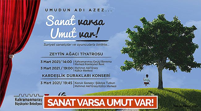Kahramanmaraş Büyükşehir Belediyesi’nin katkılarıyla, Yunus Emre Enstitüsü koordinesinde “Zeytin Ağacı Tiyatro Oyunu ve Kardeşlik Durakları Konseri” düzenlenecek. 3 Mart Çarşamba günü iki gösterimi yapılacak etkinliğin ilki saat 14.00’da Geçici Barınma Merkezi’nde gerçekleştirilecek. İkinci gösterim ise saat 19.00’da Mehmet Akif Ersoy Kültür Merkezi’nde seyirciyle buluşturulacak.
