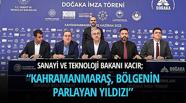 Sanayi ve Teknoloji Bakanı Mehmet Fatih Kacır konuşmasını, “Cazibe Merkezleri Destekleme Programı, Sosyal Gelişmeyi Destekleme Programı, Üreten Şehirler Programı gibi bölgesel kalkınma amaçlı tematik merkezi programlar kapsamında Kahramanmaraş başta olmak üzere deprem bölgemizin kalkınması için destek sağladık. Bu programlar kapsamında deprem bölgesinde 784 Milyon TL bütçeli 41 projeyi bugüne kadar destekleme kararı aldık. Bu çalışmalar kapsamında desteklediğimiz 34 Milyon TL bütçeli 4 projemizin sözleşmelerini imzalayacağız. Kahramanmaraş için kalkınma ajansları kaynağımızdan en az 200 Milyon TL’lik bir kaynağı önümüzdeki dönemde tahsis ediyor olacağız” cümleleriyle noktaladı.