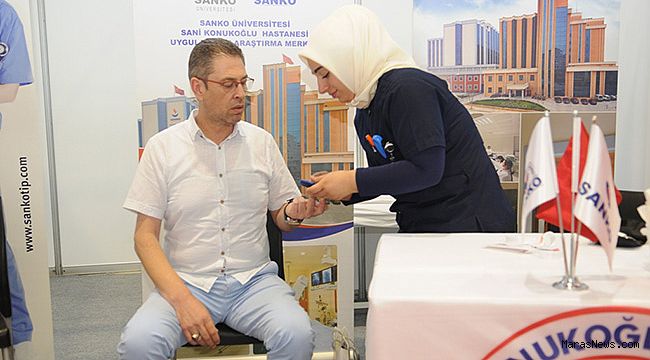 katılımcı ve ziyaretçilerin ücretsiz kan şekeri ve tansiyon ölçümü yapılıyor, hastanede