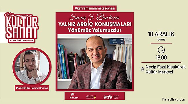 Kahramanmaraş Büyükşehir Belediyesi Aralık Kültür Sanat Etkinlikleri, söyleşi programıyla sürüyor. Takvim kapsamında, sanat, kültür ve politika alanında birçok yayının altında imzası bulunan Akademisyen – Yazar Dr. Savaş Ş. Barkçin ile söyleşi etkinliği düzenlenecek. “Yalnız Ardıç Konuşmaları” temasında “Yönümüz Yolumuzdur” başlığıyla gerçekleştirilecek etkinlikte, yolda olmanın anlamına farklı açılardan ışık tutulacak. 10 Aralık Cuma günü saat 19.00’da Necip Fazıl Kısakürek Kültür Merkezi’nde gerçekleştirilecek etkinliğin moderatörlüğünü ise Samed Karataş üstlenecek. Kültür Spor ve Turizm Daire Başkanlığı’ndan yapılan açıklamada söyleşi etkinliğine tüm vatandaşların davet edildiği bildirildi.