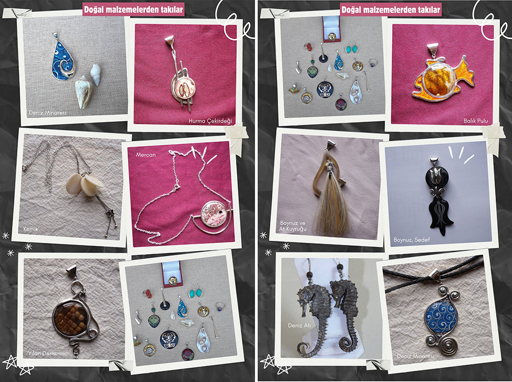 Boynuzla başlayan atıkları yaşatma serüveni çam kozalakları, selvi kozalakları, zeytin çekirdekleri, hurma çekirdekleri, ceviz kabukları, deniz kabukları gibi çevresel maddeleri de kıymetli ziynet eşyalarına dönüştürerek devam ediyor. Kuyumculuk teknikleri ile tabiatın sunduğu doğal malzemeleri kendine has yorumuyla harmanlayarak kullanılabilir malzemeler haline getiren ve görenleri şaşkına çeviren sanatçı neler yapmıyor ki? Karanfillerden, canlı çiçeklerden, yılan derilerinden takılar, caretta caretta kabuklarından aynalar, hindistan cevizi kabuğundan rebab denilen müzik aletleri ve yine boynuzdan tarağın dışında hoşaf kaşıkları, bıçaklar gibi envai çeşit ürünlere imza atıyor. Zaten sedefin de deniz kabuklarından elde edildiğinin altını çizerken sanat felsefesi hakkında şöyle konuşuyor, “Çam kozalakları içine dolgu yapılıp kesildiği zaman çiçek gibi çok güzel yan kesitler oluşturur. Yine deniz minarelerinden de enine kesitler yapıldığı zaman çok farklı desenler elde edilebilir. Her çevresel maddenin güzel bir tarafı var. Ve aslında hiçbir şey olan şeylerden birçok şey yapılır. O yüzden çevredeki her şey değerlendirilebilir anlayışı bende öncelikli ve baskın. Babamın söylediği gibi aslında gerçekten açlık yok. Sadece çevreye biraz daha dikkatli bakmak lazım. Zaten benim amacım da bunu göstermek ve yokluktan bir şeyler ortaya çıkarmak. Ve bütün toplamalarım ‘yapa/bilmek’ üzerine. Yani yapmak için bilmek.”
