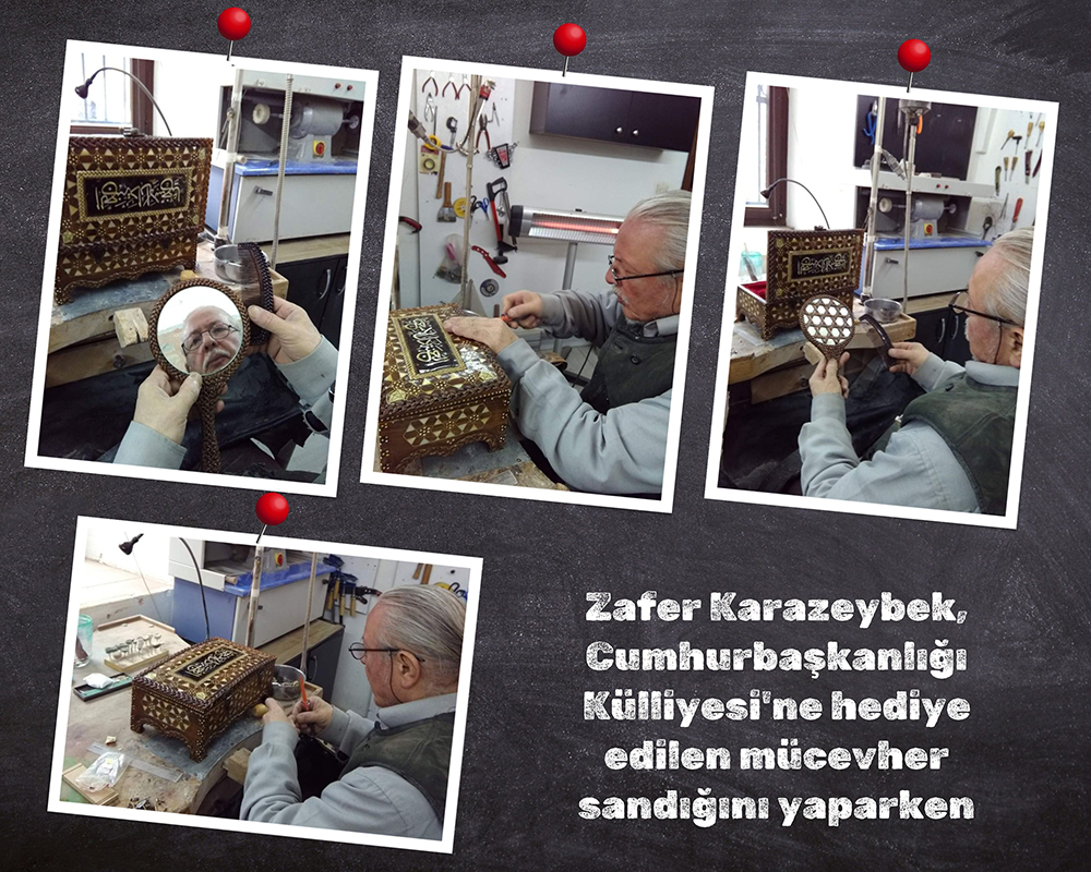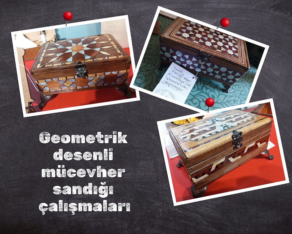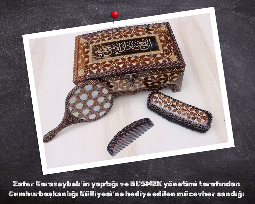 Bursa Büyükşehir Belediyesi Sanat ve Meslek Eğitim Kursları’nda (BUSMEK) altı yıl kursiyerlere eğitim verdiği dönemde birçok geometrik çalışmaya da imza atıyor. Yeşil Camii’nin geometrik desenlerini konu aldığı mücevher sandığı çalışmasının BUSMEK yönetimi tarafından Cumhurbaşkanlığı Külliyesi’ne hediye edildiğini belirten Karazeybek, “Yeşil Camii’nin geometrisine yer verdiğim özel bir sandık çalışması yapmıştım. Sandığın orta kısmına cami içindeki yazılardan boynuz üzerine sedef kakma ve Osmanlıca olarak ‘Fakirlik benim övüncümdür. Cennet cömertlerin yurdudur’ hadisi şerifini aktardım. Kenarlarında ise kemik bir zencerek var. Zencerek, birbirine geçmeli kemiğin iç içe oyması sonucu elde edilen bir teknik. Çok kullanılan bir teknik değil. Kullandığım bütün teknikler Yeşil Türbe’nin anlatımıydı ki, sandığın içine koyulacak nesneleri de düşündük. Ayna, tarak ve elbise fırçasıyla çalışmayı daha da zenginleştirdik” ifadelerine yer veriyor.