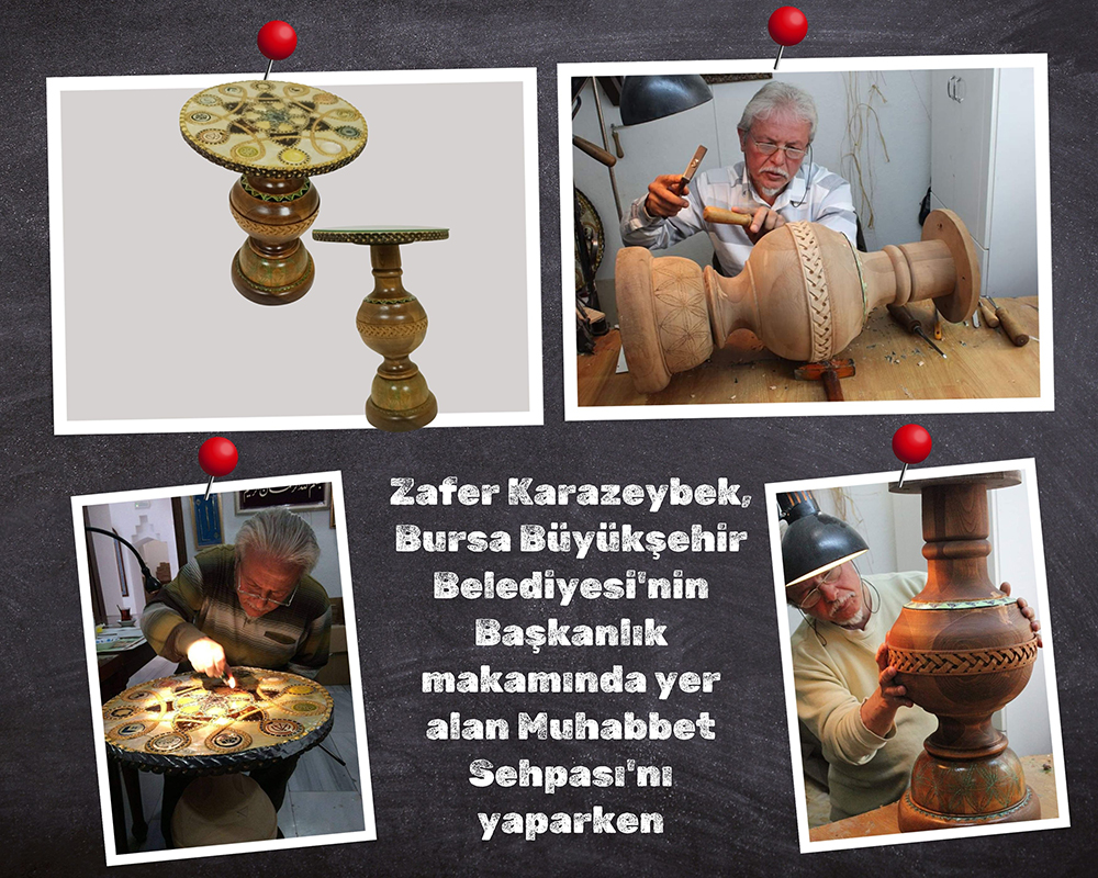 Bursa mimarisindeki geometrik şekilleri yaptığı takılara ve hediyelik eşyalara da aktardığının altını çizen Karazeybek, “Kentin yerel değerlerini önemsediğim için yaptığım çalışmalarda Bursa esaslı şeyler oluşturmaya başladım. Bursa mimarisini takı ve kutu üzerinde mütemadiyen kullandım. Cumhurbaşkanlığı Külliyesine hediye edilen Yeşil Türbe konseptli çalışmam da böyle bir eserdi. Hediyelik eşya olarak şehrimizin kültür, sanat, turizm etkinlikleri çerçevesinde bu ürünlerin yeniden tanıtılması ve üretilmesi anlamında Bursa çizgisinde bir sanatkâr haline geldim” diyor. Amacının, yaşadığı müddetçe Bursa’ya hizmet etmek olduğunun altını çizen sanatçı, kentin yerel yöneticilerine de çağrıda bulunarak, “Şehrin yereli üzerinde, bıçakçılığından ipekçiliğine, kemerciliğinden hediyelik eşyasına kadar neredeyse dokunmadığım kısmı kalmadı. Bu anlamda şehrin yöneticilerinden ürünlerimizin ve kültürümüzün yine kentimize katkı sağlaması için destek bekliyorum. Şehrimiz için hep birlikte çalışalım. Doğal ve yerel değerlerimizi birlikte yaşatalım” diyor.