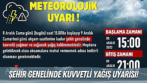 Kahramanmaraş Büyükşehir Belediyesine bağlı Afet Koordinasyon Merkezi (AKOM), 8 Aralık Cuma günü (bugün) saat 15.00 civarında şehir genelinde kuvvetli yağmur ve sağanak yağış beklendiğini duyurdu. 9 Aralık Cumartesi günü akşam saatlerine kadar devam edeceği öngörülen yağışlar neticesinde meydana gelebilecek olası sel, su baskını ve ulaşımda aksamalara karşı dikkatli ve tedbirli olunması noktasında vatandaşlar uyarıldı. AKOM’dan yapılan açıklamada; kuvvetli yağışlar neticesinde meydana gelebilecek olası aksamalara mahal vermemek adına tüm önlemlerin alındığı, ekiplerin teyakkuz halinde olduğu ve herhangi bir olumsuzlukla karşılaşılması durumunda vatandaşların 112 Acil Çağrı Merkezi’nden İtfaiye ekiplerine ve ALO 153’ten Afet Koordinasyon Merkezi’ne (AKOM) ulaşabilecekleri belirtildi.