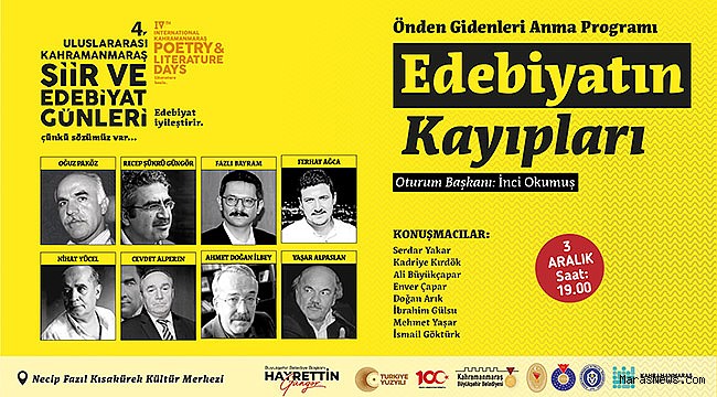Kahramanmaraş Büyükşehir Belediyesinin ‘Edebiyat İyileştirir’ mottosuyla düzenlediği 4. Uluslararası Kahramanmaraş Şiir ve Edebiyat Günleri’nin ikinci gününde çok anlamlı bir etkinlik gerçekleştirilecek. 3 Aralık Pazar günü Necip Fazıl Kısakürek Kültür Merkezi’nde; Serdar Yakar, Kadriye Kırdök, Ali Büyükçapar, Enver Çapar, Doğan Arık, İbrahim Gülsu, Mehmet Yaşar ve İsmail Göktürk’ün katılımıyla düzenlenecek ‘Edebiyatın Kayıpları’ adlı panelde; ahirete irtihal eden şair ve yazarlar yâd edilecek. Oturum Başkanlığını Şair – Yazar İnci Okumuş’un yapacağı program saat 19.00’da başlayacak. Büyükşehir Belediyesinden yapılan açıklamada; 3 Aralık Pazar günü saat 19.00’da Necip Fazıl Kısakürek Kültür Merkezi’nde düzenlenecek ‘Edebiyatın Kayıpları’ adlı panele tüm edebiyatseverlerin davetli olduğu ve 10 Aralık Pazar gününe kadar devam edecek 4. Uluslararası Kahramanmaraş Şiir ve Edebiyat Günleri etkinlik takvimine https://kahramanmaras.bel.tr/duyuru/2023/11/29/4-uluslararasi-kahramanmaras-siir-ve-edebiyat-gunleri internet adresinden ulaşılabileceği belirtildi.