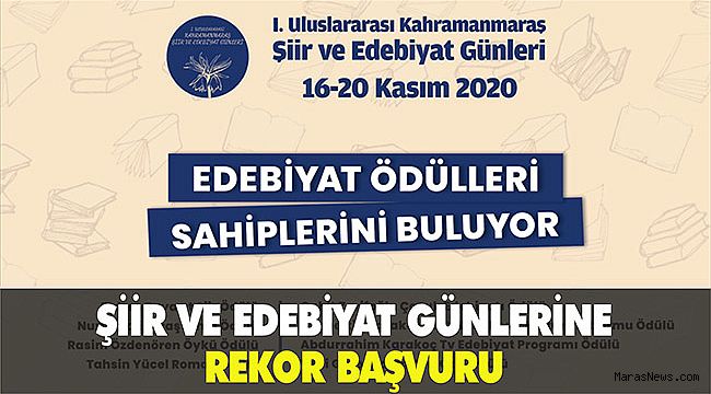 Kahramanmaraş Büyükşehir Belediyesi tarafından, bu yıl ilki düzenlenecek olan 1. Uluslararası Şiir ve Edebiyat Günleri Yarışmalarına başvurular sona erdi. Büyükşehir Belediyesi Kültür Spor ve Turizm Dairesi Başkanlığı tarafından düzenlenecek olan 1. Uluslararası Şiir ve Edebiyat Günleri için 8 ayrı dalda yarışma düzenlendi. Şiir, öykü, deneme, resim ve Aşık Mahsuni Şerif Ses Yarışması’na toplam 4022 adet başvuru gerçekleştirildi.