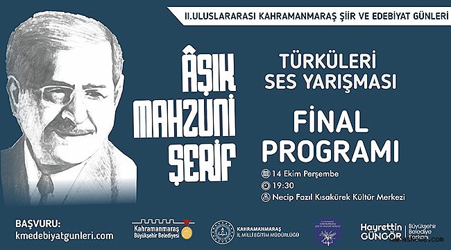 Kahramanmaraş Büyükşehir Belediyesi tarafından bu yıl ikincisi düzenlenen “Uluslararası Şiir ve Edebiyat Günleri” etkinliklerinde geri sayım başladı. Etkinlikler kapsamında 15 ülkeden yazar ve şairin katılımıyla 5 gün boyunca düzenlenecek 100’e yakın etkinliğin yanı sıra 14 farklı yarışmada da ödüller sahibiyle buluşacak. Kısa film, müzik, resim, şiir okuma ve yazma, deneme ve mektup gibi pek çok branşta düzenlenen yarışmaların finallerinde adaylar kıyasıya rekabet ediyor. Etkinliklerden, “Aşık Mahzuni Şerif Türküleri Ses Yarışması” final programına da sayılı günler kaldı. 14 Ekim Perşembe günü düzenlenecek final yarışması sonrası dereceye giren katılımcılar jüri üyeleri tarafından belirlenecek. Necip Fazıl Kısakürek Kültür Merkezi’nde saat 19.30’da başlayacak programda, finalistler Hatice Gökçeli, Hande Akpınar Alicem Atmaca, Gizem Ergün, Fatih Furkan Pehlivan, Süleyman Güçlü, Ali Çorukcu, Gamze Keklicek, Arzu Gemli Nedirli ve Buğrahan Sezen performanslarını sergileyecek.
