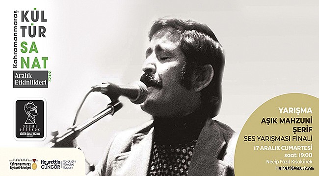 Kahramanmaraş Büyükşehir Belediyesi tarafından düzenlenen Âşık Mahzuni Şerif Türküleri Ses Yarışması’nda final heyecanı yaşanıyor. Yoğun katılımın olduğu ses yarışmasında tamamlanan ön elemelerin ardından finale kalmayı başaran 10 yarışmacı, 17 Aralık Cumartesi günü Necip Fazıl Kısakürek Kültür Merkezi’nde saat 19.00’da gerçekleştirilecek programda dereceye girebilmek için performanslarını sergileyecek. Büyükşehir Belediyesi’nden yapılan açıklamada, Âşık Mahzuni Şerif Türküleri Ses Yarışması finaline tüm müzikseverlerin davetli olduğu belirtildi.