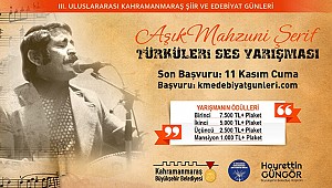 Kahramanmaraş Büyükşehir Belediyesi, kültür ve sanatın nabzını tutacak önemli bir organizasyonu daha hayata geçirmeye hazırlanıyor. Bu yıl 3’üncüsü düzenlenecek Uluslararası Kahramanmaraş Şiir ve Edebiyat Günleri’nde düzenlenecek ödüllü yarışmada başvurular başladı. Âşık Mahzuni Şerif Türküleri Ses Yarışması adı taşıyan organizasyonda dereceye giren yarışmacılardan birinciye 7 bin 500 TL, ikinciye 5 bin TL, üçüncüye 2 bin 500 TL ve mansiyon almaya hak kazananlara ise bin TL ve plaket ödülü takdim edilecek. Çevrimiçi ortamda www.kmedebiyatgunleri.com internet adresinden yapılabilen başvuruların, 11 Kasım Cuma gününe kadar devam edeceği bildirildi.