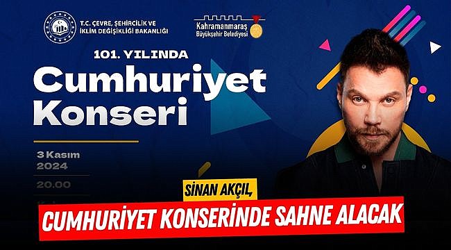 Cumhuriyet'in kuruluşunun 101. yıl dönümü dolayısıyla şehrin muhtelif noktalarında çeşitli etkinlik ve gösteriler düzenleyerek 7'den 70'e tüm vatandaşlara Cumhuriyet coşkusunu yaşatan Kahramanmaraş Büyükşehir Belediyesi, şimdi de Cumhuriyet Konseri düzenleyecek. Çevre, Şehircilik ve İklim Değişikliği Bakanlığı iş birliğiyle 3 Kasım Pazar günü düzenlenecek konserde, pop müziğin sevilen ismi Sinan Akçıl sahne alacak. Milli İrade Meydanı'nda gerçekleştirilecek konserde Sinan Akçıl; en hit parçalarının yanı sıra son albümünden de en sevilen eserleri Kahramanmaraşlı müzikseverler için seslendirecek. Büyükşehir Belediyesinden yapılan açıklamada, ücretsiz olarak düzenlenecek ve saat 20.00'da başlayacak ücretsiz konsere tüm müzikseverler davet edildi.