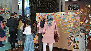 Kitap fuarı süresince hizmet veren bu köşeye asılan