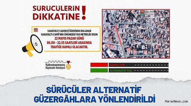 Kahramanmaraş Büyükşehir Belediyesi Fen İşleri Dairesi Başkanlığı koordinesindeki ekipler tarafından, Sarayaltı Bağlantı Yolu projesi kapsamında Dulkadiroğlu İsa Divanlı Mahallesi’nde bir dizi çalışma gerçekleştiriliyor. Çalışmalar kapsamında alınan UKOME kararı doğrultusunda Sarayaltı Caddesi üzerinde bulunan Sarayaltı Camii’nin önündeki 100 metrelik kısmın 22 Mayıs Pazar günü 06.00 – 22.55 saatleri arasında trafiğe kapalı olacağı belirtildi. Ulaşım Dairesi Başkanlığı’ndan karara ilişkin yapılan açıklamada, “Fen İşleri Dairesi Başkanlığı koordinesindeki ekipler tarafından Dulkadiroğlu İsa Divanlı Mahallesi’nde gerçekleştirilen çalışmalar dolayısıyla Sarayaltı Caddesi üzerinde bulunan Sarayaltı Camii’nin önündeki 100 metrelik kısım 22 Mayıs Pazar günü 06.00 – 22.55 saatleri arasında trafiğe kapalı olacaktır. Trafikte meydana gelebilecek aksamalara mahal vermemek adına sürücülerimizin alternatif güzergâhları tercih etmeleri önem arz etmektedir” ifadeleri kullanıldı.