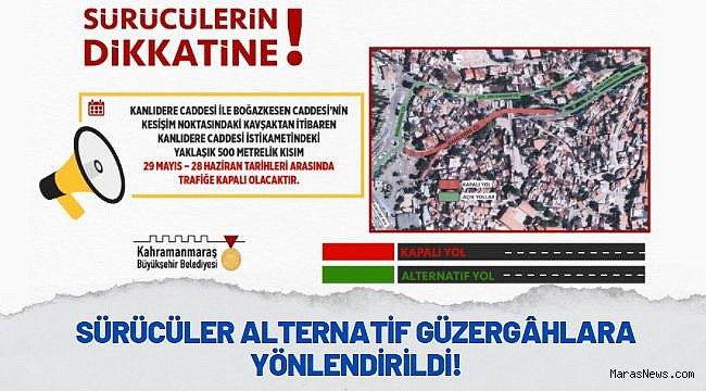 Kahramanmaraş Büyükşehir Belediyesi, Sarayaltı – Kanlıdere - Kale Bağlantı Yolu projesi kapsamında bölgede bir dizi çalışma gerçekleştiriyor. Bu kapsamda alınan UKOME kararı doğrultusunda Kanlıdere Caddesi ile Boğazkesen Caddesi’nin kesişim noktasındaki kavşaktan itibaren Kanlıdere Caddesi istikametindeki yaklaşık 500 metrelik kısım 29 Mayıs – 28 Haziran tarihleri arasında trafiğe kapalı olacaktır. Ulaşım Dairesi Başkanlığı’ndan karara ilişkin yapılan açıklamada, “Trafikte oluşabilecek aksamalara mahal vermemek adına sürücülerin alternatif güzergâhlara yönelmeleri önem arz etmektedir” ifadelerine yer verildi.