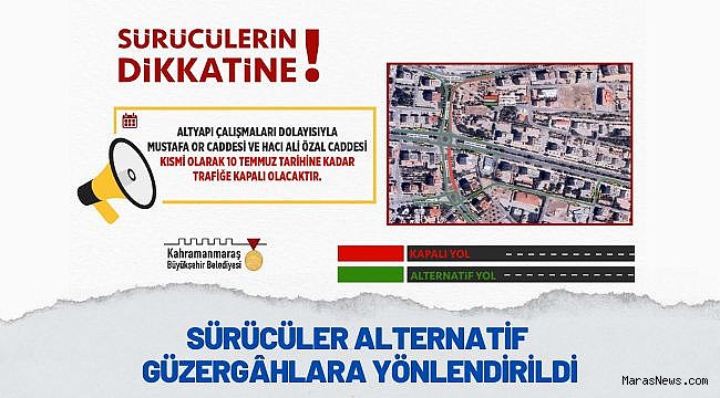 Kahramanmaraş Büyükşehir Belediyesi, KASKİ Genel Müdürlüğü ekipleri Onikişubat Mimar Sinan Mahallesi’nde bir dizi altyapı çalışması gerçekleştiriyor. Çalışmalar kapsamında alınan UKOME kararı doğrultusunda Alparslan Türkeş Bulvarı ile Mustafa Or Caddesi’nin kesişim noktasındaki kavşaktan itibaren Mustafa Or Caddesi istikametindeki yaklaşık 100 metrelik kısmın 10 Temmuz tarihine kadar trafiğe kapalı olacağı belirtildi. Yine alınan karar doğrultusunda Alparslan Türkeş Bulvarı ile Hacı Ali Özal Caddesi’nin kesişim noktasındaki kavşaktan itibaren Hacı Ali Özal Caddesi istikametindeki yaklaşık 200 metrelik kısmın tek şeridi 10 Temmuz tarihine kadar trafiğe kapalı olacak. Ulaşım Dairesi Başkanlığı’ndan karara ilişkin yapılan açıklamada, “Vatandaşlarımızın trafikte dikkatli olmaları ve alternatif güzergâhları tercih etmeleri önem arz etmektedir” ifadelerine yer verildi.