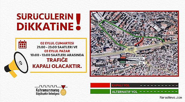 Kahramanmaraş Büyükşehir Belediyesi, Onikişubat ilçesinde Karamanlı Mahallesi’nde yer alan bazı yapıların yıkımlarını gerçekleştirecek. Bu kapsamda, Kazım Karabekir Caddesi’nin bir bölümü geçici süreyle trafiğe kapatılacak. Alınan karara göre, 2 Ekim Cumartesi günü saat 21.00’da başlayacak yol kapama, saat 23.00’a kadar sürecek. 3 Ekim Pazar günü ise saat 10.00 ila 13.00 arası kapalı olacak yol, yıkımların ardından tekrar trafiğe açılacak. Ulaşım Hizmetleri Dairesi Başkanlığı’ndan yapılan açıklamada, “Onikişubat ilçesi Karamanlı Mahallesi’nde gerçekleştirilecek yıkım çalışmaları nedeniyle Kazım Karabekir Caddesi geçici süreyle trafiğe kapatılacaktır. Vatandaşlarımız belirlenen saatler arası kapanacak artere alternatif olarak 4003 Sokak ve Saparmurat Niyaziov Caddesi istikametinden ulaşım sağlayabilir” ifadelerine yer verildi.
