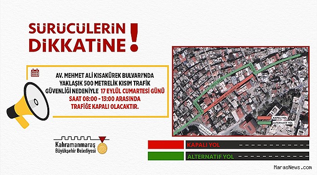 Kahramanmaraş Büyükşehir Belediyesi, Onikişubat ilçesi Dumlupınar Mahallesi’nde faaliyet gösteren şantiyenin inşai çalışmaları dolayısıyla trafikte güvenlik tedbiri aldı. Bu kapsamda, Av. Mehmet Ali Kısakürek Bulvarı’nın bir bölümünün 17 Eylül Cumartesi günü 08.00 ve 13.00 saatleri arasında trafiğe geçici süreyle kapatılacağı duyuruldu. Ulaşım Dairesi Başkanlığı’ndan UKOME kararı doğrultusunda alınan güvenlik tedbiriyle ilgili, “19026. Sokak’ta yer alan şantiyenin betonarme faaliyeti dolayısıyla arter geçici süreyle trafiğe kapatılacaktır. Sürücülerimiz, alternatif güzergâhları kullanarak bölgeye ulaşım sağlayabilirler” ifadelerine yer verildi.