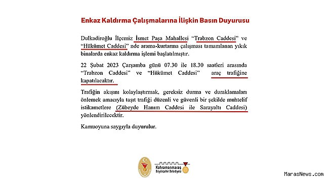 Enkaz kaldırma çalışmalarına ilişkin Büyükşehir Belediyesi ve Valilikten yapılan açıklamada, “Dulkadiroğlu ilçemiz İsmet Paşa Mahallesi Trabzon Caddesi ve Hükümet Caddesi’nde arama kurtarma çalışması tamamlanan yıkık binalarda enkaz kaldırma işlemi başlatılmıştır. 22 Şubat Çarşamba günü 07.30 ile 18.30 saatleri arasında Trabzon Caddesi ve Hükümet Caddesi araç trafiğine kapatılacaktır. Trafiğin akışını kolaylaştırmak, gereksiz durma ve duraklamaları önlemek amacıyla taşıt trafiği düzenli ve güvenli bir şekilde muhtelif istikametlere yönlendirilecektir” ifadelerine yer verildi.