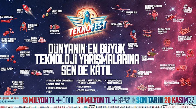 Teknoloji ve bilim konusunda farkındalık oluşturmayı, Türkiye’nin bilim ve mühendislik alanlarında yetişmiş insan kaynağını artırmayı hedefleyen Türkiye’nin ilk ve tek havacılık, uzay ve teknoloji festivali TEKNOFEST 2023’ün teknoloji yarışmaları için başvurular başladı. Cumhuriyet’in 100’üncü yılında Ankara, İzmir ve İstanbul’da gerçekleştirilecek festivalde 41 farklı alan ve 102 alt kategoride yarışmalar bulunuyor. Efsaneleşen teknoloji yarışmaları roketten uçan arabaya, biyoteknoloji inovasyondan insansız su altı sistemlerine, sağlıkta yapay zekâdan çip tasarımın yanı sıra yepyeni psikolojide teknolojik uygulamalara kadar birçok yarışmanın düzenleneceği TEKNOFEST 2023’te 13 Milyon TL’den fazla ödül ve 30 Milyon TL’den fazla malzeme desteği yarışmacılarla buluşacak. Bireysel veya takım olarak katılım sağlanabilen TEKNOFEST 2023 teknoloji yarışmalarına https://www.teknofest.org/tr/ adresi üzerinden başvuru yapılabiliyor. Yarışmalara ilişkin detaylı bilgiye yine aynı internet adresi üzerinden ulaşılabiliyor. Son başvuru tarihi 20 Kasım Pazar.