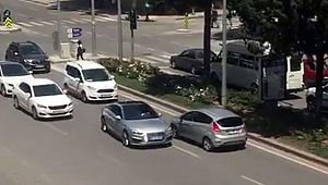 yeşil ışığın yanması ile birlikte sürücü yol ortasında kalarak karşıya