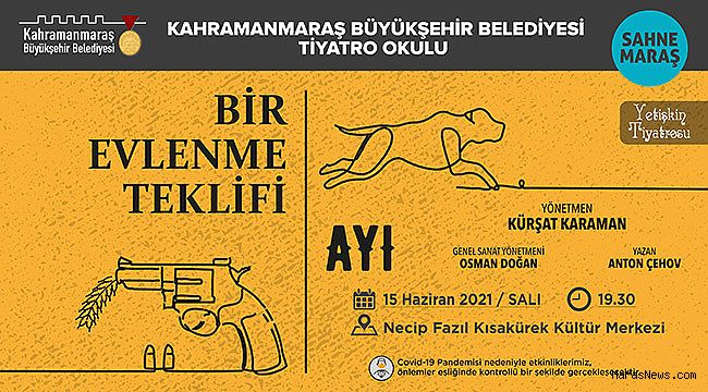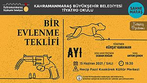 Kahramanmaraş Büyükşehir Belediyesi tarafından gerçekleştirilen Sahne Maraş tiyatro okulu meyvelerini vermeye başlıyor. Oyuncu adayları tarafından uzun süredir provaları yapılan 4 yeni oyun Haziran ayı içinde seyirci karşısına çıkacak. Yetişkin ve çocuk oyunlarının da yer aldığı tiyatro takviminde, ilk gösterim gülmece türündeki “Bir Evlenme Teklifi - Ayı” oyunuyla ücretsiz olarak sahnelenecek. Toplumcu gerçekçi Rus yazar Çehov tarafından kaleme alınan oyun, insanın kendine has yapısını gülünç bir dille anlatıyor. 15 Haziran Salı günü (yarın) 19.30’da Necip Fazıl Kültür Merkezi’nde gerçekleştirilecek tiyatro oyunu, Sahne Maraş’ın genç yetenekleri tarafından kültür sanat dostlarının beğenisine sunulacak.