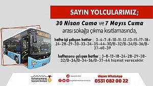 Kahramanmaraş Büyükşehir Belediyesi toplu taşıma araçlarının sefer sayı ve saatlerinde güncellemeye gitti. İçişleri Bakanlığı tarafından yayınlanan genelge kapsamında uygulanacak tam kapanma süreci sonrası 30 Nisan Cuma ila 7 Mayıs Cuma tarihleri arasında hafta içi çalışacak hatlar, 3, 4, 7, 8, 10, 11, 12, 13, 15, 17, 18, 24, 28, 29, 30, 33, 34, 35, 44, 30/B, 32/B, 34/B, 36/B, 37, 60 ve 39 numaralı seferler olarak belirlendi. Hafta sonu ise 3, 8, 13, 18, 24, 28, 29, 30, 32/B, 34/B, 34, 36/B, 37 ve 44 sefer numaralı hatlar hizmet vermeyi sürdürecek. Ulaşım Hizmetleri Dairesi Başkanlığı’ndan kısıtlılık süresince çalışan sefer saatlerine https://kahramanmaras.bel.tr/toplu-tasima-guzergah-ve-saatleri adresinden ulaşılabileceği veya 0531 082 00 22 numaralı “Ulaşım Whatsapp” hattı üzerinden bilgi alınabileceği ifade edildi.