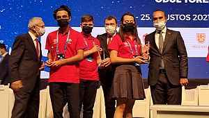 SANKO Fen ve Teknoloji Lisesi 9’uncu sınıf öğrencileri Gökçe Bilge, Mustafa Ali Şahin ve Yiğit Settar Evgülü Türkiye ikinciliği ödülünü TÜBİTAK Başkanı Prof. Dr. Hasan Mandal, Milli Eğitim Bakan Yardımcısı Prof. Dr. Ahmet Emre Bilgili ile Sanayi ve Teknoloji Bakan Yardımcısı Mehmet Fatih Kacır’dan aldılar.
