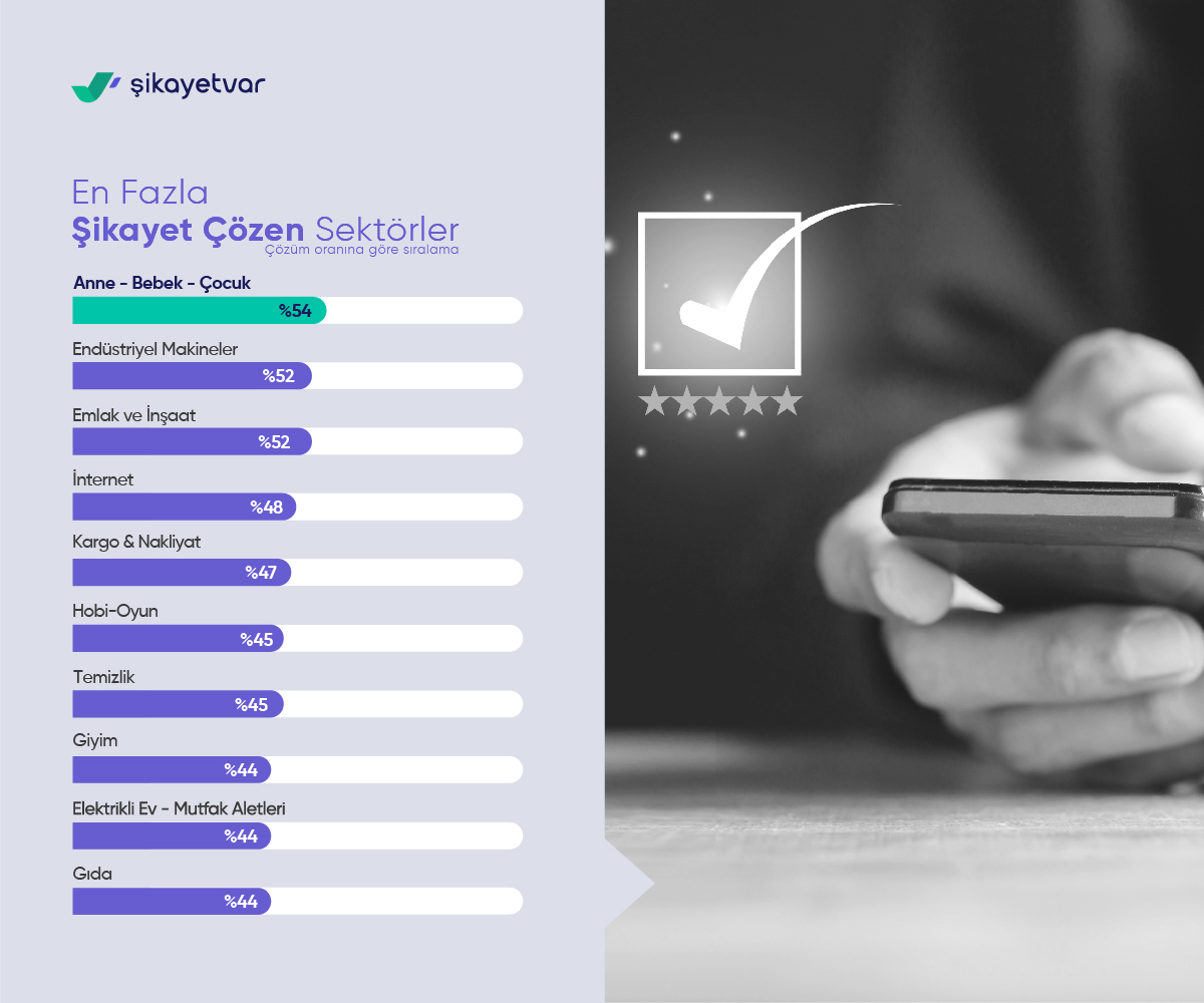 Çözüm platformu Şikayetvar’ın verilerine göre 2022’de müşterisini en çok memnun eden sektör geçtiğimiz yıllarda olduğu gibi yüzde 54'lük memnuniyet oranı ile anne-bebek-çocuk sektörü oldu. Endüstriyel makineler sektörü yüzde 52 memnuniyet oranıyla ikinci sırada yer alırken emlak ve inşaat sektörüyle internet platformları müşterisini en çok dinleyen diğer sektörler oldu.