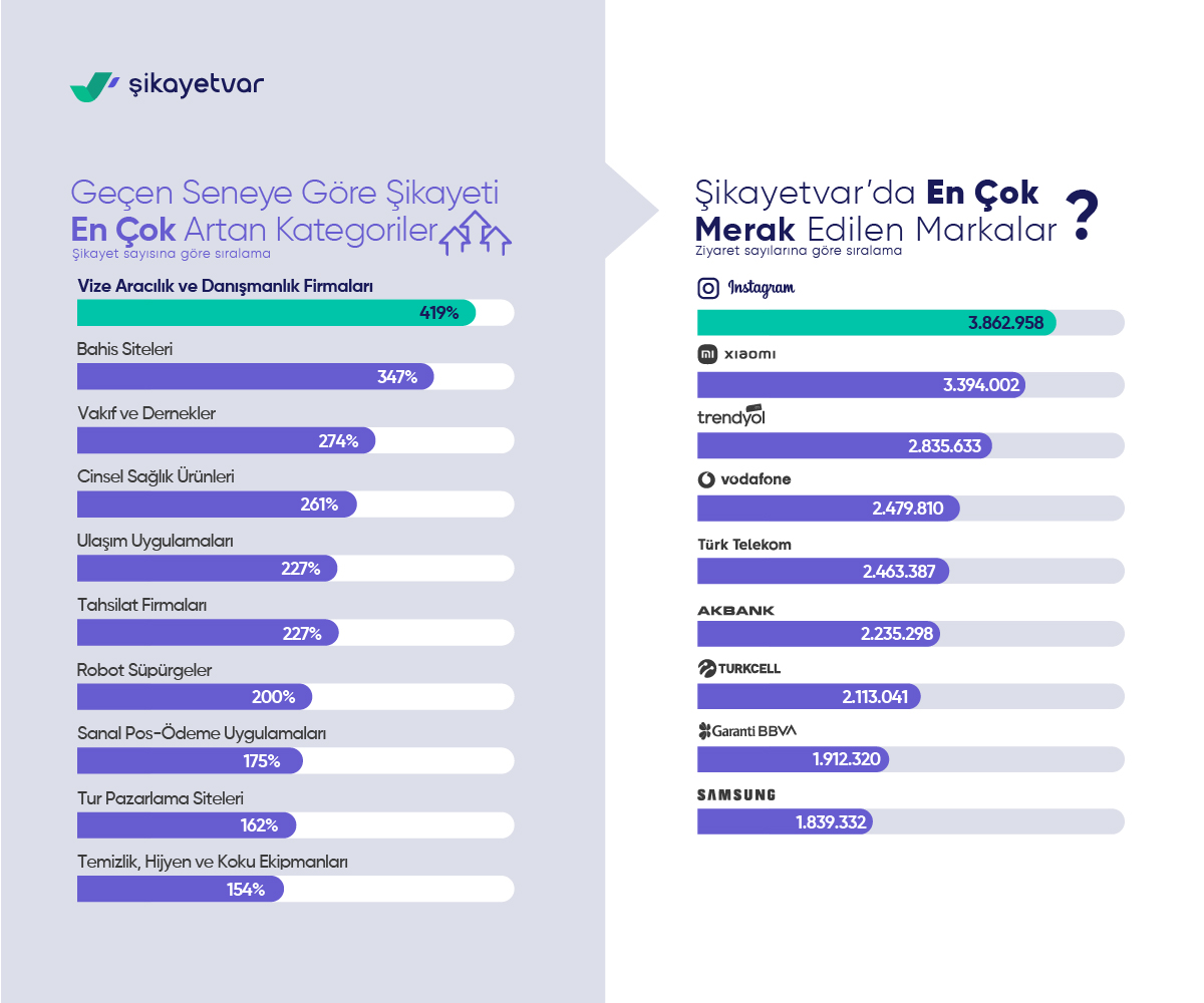 Şikayetvar’ın 2022 verilerine göre yıl içinde şikayet artış oranıyla dikkat çeken kategorilerin başında yüzde 419’luk bir yükselişle vize aracılık ve danışmanlık firmaları geldi. Yüzde 347’lik şikayet artış oranına sahip bahis siteleri ikinci sırada yer alırken onu vakıf ve dernekler kategorisi izledi (yüzde 274). Verilere göre cinsel sağlık ürünleri ve ulaşım uygulamaları 2022’de en çok şikayet artışına sahip diğer sektörler oldu.