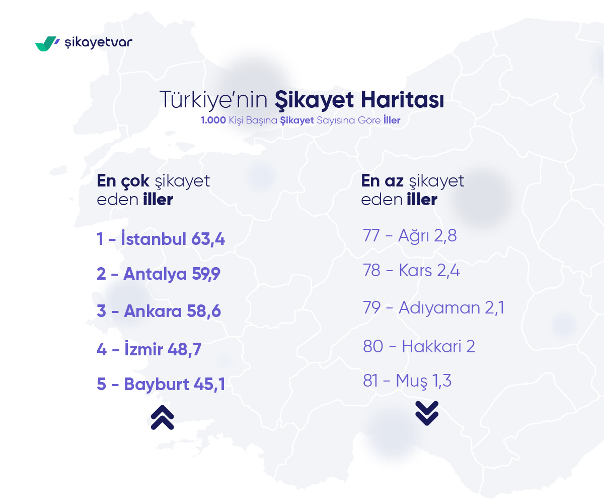 Nüfus ortalamasına göre 2022’de bin kişi başına düşen şikayet sayısı baz alındığında 63.4 şikayet yoğunluğuyla en çok şikayet eden şehir İstanbul oldu. İstanbul’u; Antalya, Ankara ve İzmir takip etti. Şikayetvar verilerine göre geçmiş yıllarda olduğu gibi 2022’de Muş en az şikayet oluşturan il olarak kaydedildi. En az şikayetçi olan diğer iller Hakkari, Adıyaman ve Kars olarak sıralandı.
