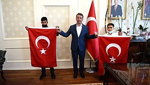 Herkesi duygulandıran bayrak sevgisini gösteren İki çocuğun görüntülerinin sosyal medyada yayımlanması sonrası Türkoğlu Belediye Başkanı Osman Okumuş Karaca ve Karataş'ı makamında ağırlayarak bir süre sohbet etti.