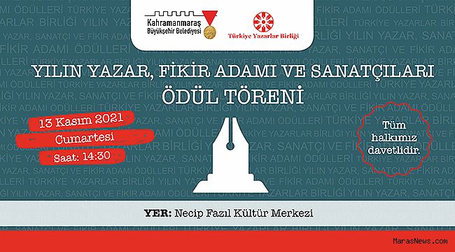 Türkiye Yazarlar Birliği (TYB) tarafından her yıl verilen “Yılın Yazar, Fikir Adamı ve Sanatçıları” ödül töreni bu yıl Kahramanmaraş’ta düzenlenecek. Kahramanmaraş Büyükşehir Belediyesi’nin katkılarıyla düzenlenen programda, toplamda 30 ödül sahibini bulacak. 13 Kasım Cumartesi günü, saat 14.30’da Necip Fazıl Kısakürek Kültür Merkezi’nde gerçekleştirilecek programda ödül alacak kişi, kurum ve eserler ise şöyle: