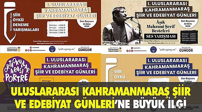 Yarışmalara ilişkin Kültür Spor ve Turizm Dairesi Başkanlığı’ndan yapılan açıklamada: “1. Uluslararası Kahramanmaraş Şiir ve Edebiyat Günleri kapsamında 8 ayrı dalda düzenlediğimiz yarışmalara başvurular sona erdi. Yarışmalara katılım sağlayan tüm yarışmacılara teşekkür ediyor başarılar diliyoruz. Jüri üyelerinin yapacağı değerlendirmeler sonucu dereceye girenlerin isimleri 12 Kasım 2020 tarihinde saat 17.00 itibari ile kurumsal web sitemiz olan www.kahramanmaras.bel.tr adresinden ilan edilecek” denilerek bilgi verildi.