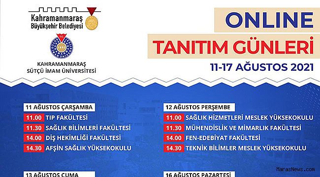 Kahramanmaraş Büyükşehir Belediyesi, Kahramanmaraş Sütçü İmam Üniversitesi işbirliğiyle kentteki eğitim olanaklarını öğrenci adaylarına tanıtıyor. KSÜ’de bulunan fakülte ve yüksekokulların tanıtılacağı programlar Büyükşehir Belediyesi instagram hesabından canlı yayınlanacak. 11 Ağustos Çarşamba (bugün) başlayan tanıtım günleri, 17 Ağustos Salı gününe kadar devam edecek. Fakülte ve yüksekokullarda bulunan lisans ile önlisans programlarının tanıtılacağı yayınlarda, kampüs ve yurt imkânlarından ulaşıma kadar pek çok başlık konuşuluyor.