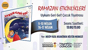 Kültür Spor ve Turizm Dairesi Başkanlığı’ndan etkinliklere ilişkin yapılan açıklamada, “Ramazan ayında da kültür sanat etkinliklerimiz hız kesmeden devam ediyor. Bu kapsamda, Uykum Geri Gel adlı çocuk tiyatrosu miniklerle buluşacak. 9, 10, 16 ve 17 Nisan tarihlerinde Necip Fazıl Kısakürek Kültür Merkezi’nde sahnelenecek oyunlara tüm çocuklar davetlidir” ifadelerine yer verildi.