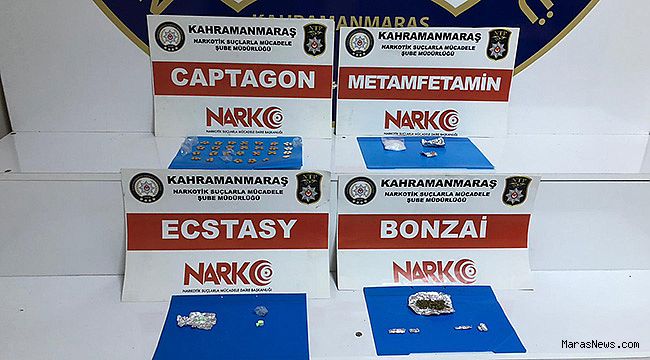 Uyuşturucu alıcısı bir şahıstan iki paket alüminyum folyo içerisinde 0.36 gram bonzai, bir başka alıcı şahıstan bir paket alüminyum folyoya sarılı daralı ağırlığı 1.54 gram bonzai, bir diğer alıcı şahıstan bir adet folyoya sarılı ECSTASY 1 paket alüminyum folyoya sarılı vaziyette 1.26 gram gelen metamfetamin maddesi ele geçirildi.