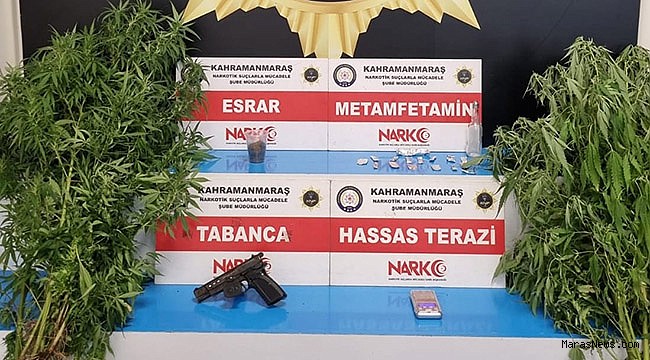 Narkotik Suçlarla Mücadele Şube Müdürlüğümüz görevlilerince sokak satıcısı diye tabir edilen madde bağımlılarına para karşılığında uyuşturucu madde temin eden şüpheliye yönelik yürütülen çalışmada uyuşturucu alışverişi esnasında K.Ç. isimli şüpheli yakalandı. Cumhuriyet Başsavcılığı koordinesinde şüphelilerin üzerlerinde ve ikametinde gerçekleştirilen aramalarda alışveriş esnasında ele geçirilen uyuşturucu madde ile aynı özellikte ve paketlenmiş satışa hazır vaziyette uyuşturucu madde ve çeşitli miktarlarda farklı uyuşturucu maddeler ile 71 kök uyuşturucu madde üretiminde kullanılan bitki, 1 adet hassas terazi, 1 adet tabanca ve 1 adet av tüfeği ile uyuşturucu madde paketlemede kullanılan materyaller ele geçirildi.