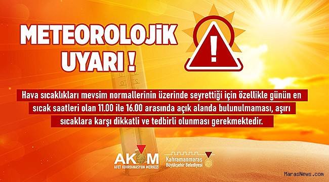 Kahramanmaraş Büyükşehir Belediyesi Afet Koordinasyon Merkezi, şehir genelinde etkisini artıran aşırı sıcaklara karşı vatandaşları uyardı. Yapılan açıklamada, hava sıcaklıklarının mevsim normallerinin çok üzerinde seyrettiği ve termometrelerin bazı bölgelerde 46 dereceyi gösterdiği ifade edildi. Özellikle sağlık açısından risk grubunda yer alan vatandaşların dikkatli olması gerektiğini vurguladı. Kronik rahatsızlığı bulunanlar, yaşlılar, hamileler ve çocukların günün en sıcak saatleri olan 11.00 ile 16.00 arasında mümkün olduğunca dışarı çıkmaması gerektiği belirtildi. Öte yandan, sıcak havaların ilerleyen günlerde de etkisini sürdüreceği tahmin ediliyor. Meteorolojik verilere göre, Kahramanmaraş’ta hafta boyunca sıcaklıkların 40 ila 46 derece arasında seyretmesi bekleniyor.