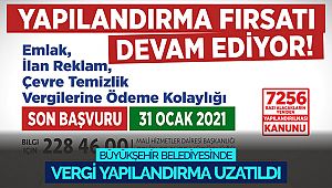 Kahramanmaraş Büyükşehir Belediyesi’nin ‘7256 Sayılı Bazı Alacakların Yeniden Yapılandırılması Kanunu’ kapsamında tüm vergi kalemlerinde başlattığı yapılandırma fırsatı vatandaşlardan gelen talep üzerine bir ay uzatıldı. Taksitli veya nakit ödeme seçeneğinin yer aldığı düzenlemede farklı vergi kalemlerindeki borçlara %90’a varan indirimler yapılıyor. Gelen yoğun talep üzerine uzatılan vergi yapılandırma fırsatında son gün 31 Ocak 2021 olarak belirlendi. Mali Hizmetler Dairesi Başkanlığı tarafından yapılan açıklamada, “Yapılandırma başvuruları 31 Ocak 2021 tarihine kadar devam edecek. Yapılandırmayla ilgili bilgi için vatandaşlarımız 0344 228 46 00 numaralı telefonu arayabilir” ifadeleri kullanıldı.