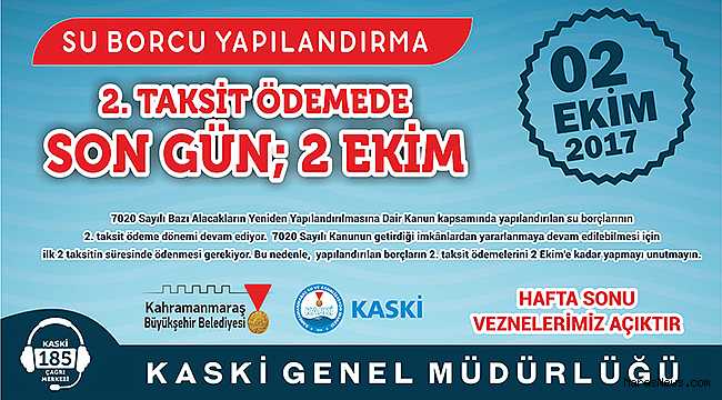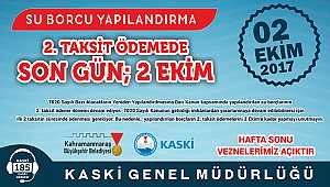 Ödemeler; KASKİ Su Tahsilat veznelerinden, anlaşmalı bankalardan ve www.maraskaski.gov.tr adresinden online olarak yapılabiliyor. KASKİ Genel Müdürlüğünce, ödeme işlemleri sırasında oluşabilecek muhtemel yoğunluktan dolayı ödemelerin son güne bırakılmaması gerektiği belirtildi.