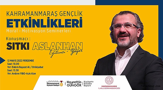 Kahramanmaraş Büyükşehir Belediyesi ve İl Milli Eğitim Müdürlüğü iş birliğiyle hayata geçirilen ‘Moral ve Motivasyon Seminerleri’ devam ediyor. Seminerler kapsamında, Kişisel Gelişim Uzmanı Eğitimci – Yazar Sıtkı Aslanhan, öğrencilerle bir araya geliyor. Hafta boyunca şehir merkezinde ve ilçelerde gerçekleştirilen seminerlerde öğrencilerle bir araya gelen Yazar Aslanhan, 12 Mayıs Perşembe günü saat 10.00’da Onikişubat Erdem Bayazıt Anadolu Lisesi ve saat 13.30’da Andırın Yatılı Bölge Ortaokulu’nu ziyaret ederek sınavlara hazırlık sürecindeki öğrencilere faydalı bilgiler aktaracak.